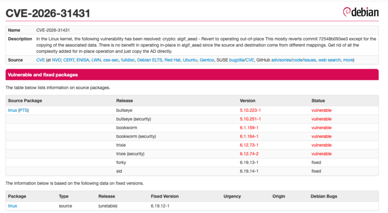 The report published by the researchers provides a few more specific names of tested distributions: Ubuntu 24.04 LTS, Amazon Linux 2023, RHEL 10.1, and SUSE 16. In reality, many distributions and versions are affected. For example, on the Debian side, there is still no security fix at the time I am writing this article (see this page).