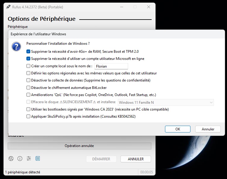 The other notable addition in version 4.14 Beta is support for silent installation, you know, the famous unattend answer file (XML format). In practical terms, Rufus takes care of creating the answer file for you so that the USB media it creates automatically detects the first disk in your machine and installs Windows 11 on it for you. The benefit: you do nothing, everything is automatic, so you do not see a single prompt on screen!