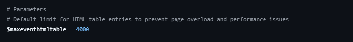 The HTML page is limited to 4,000 items to avoid making it too heavy; this value can be changed at the beginning of the script in the $maxeventhtmltable variable.