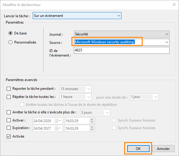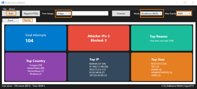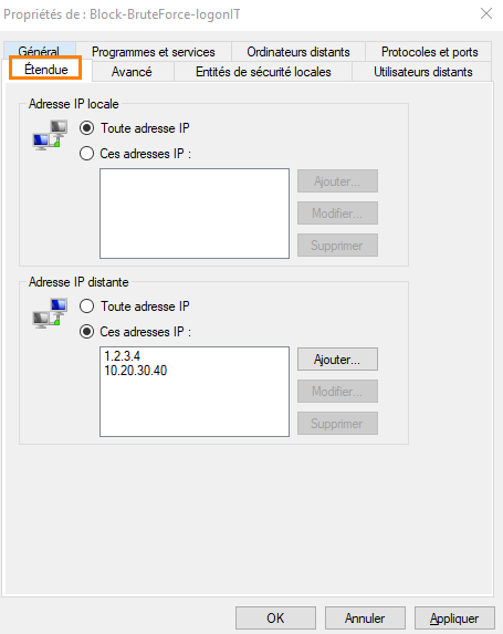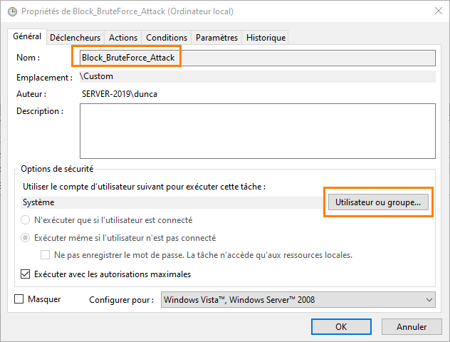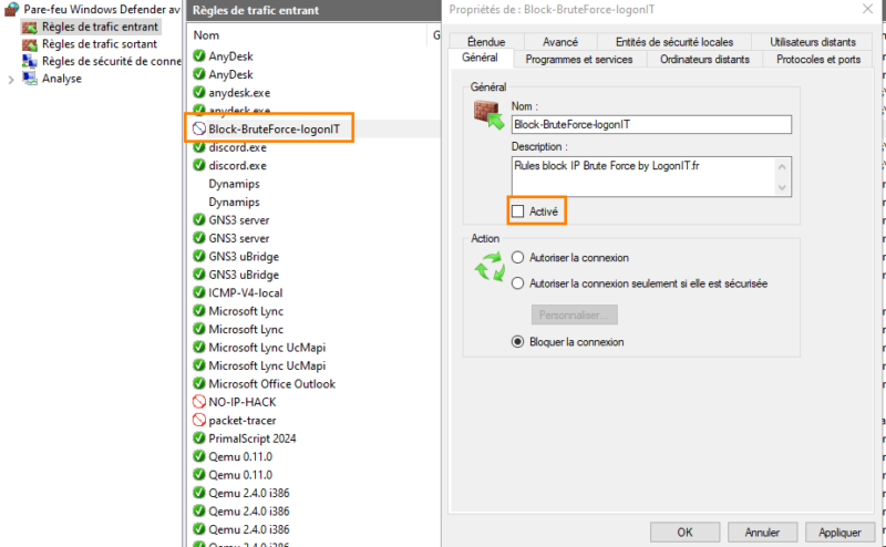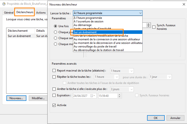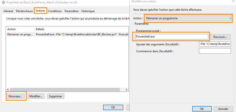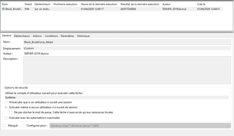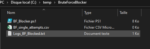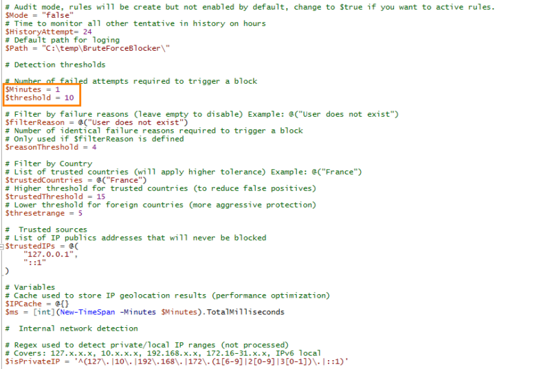 Before putting blocking mechanisms in place, it is essential to perform an assessment with the detection tool seen above in order to evaluate the level of exposure. For blocking, we will use the BrutForce_Blocker script, run through a scheduled task. It can automatically block IP addresses according to several criteria. An audit mode is also available, with historical tracking.