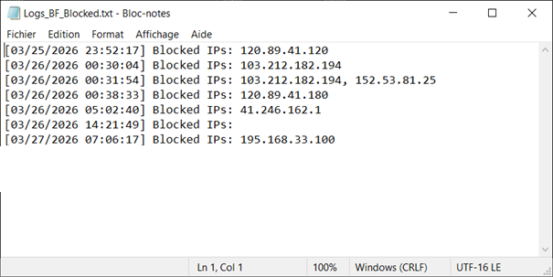 BF_blocked.log: contains the blocked IP addresses,BF_single_attempts.log: contains IPs currently being detected that have not yet reached the threshold.