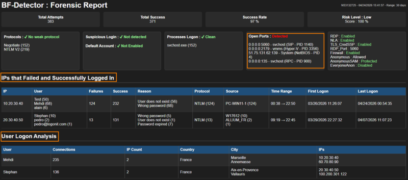 Finally, the "User Logon Analysis" section groups users who logged on remotely, associating each connection with the IP addresses used and their location. This view is particularly useful in the event of compromise, as it makes it possible to quickly detect a suspicious logon.
