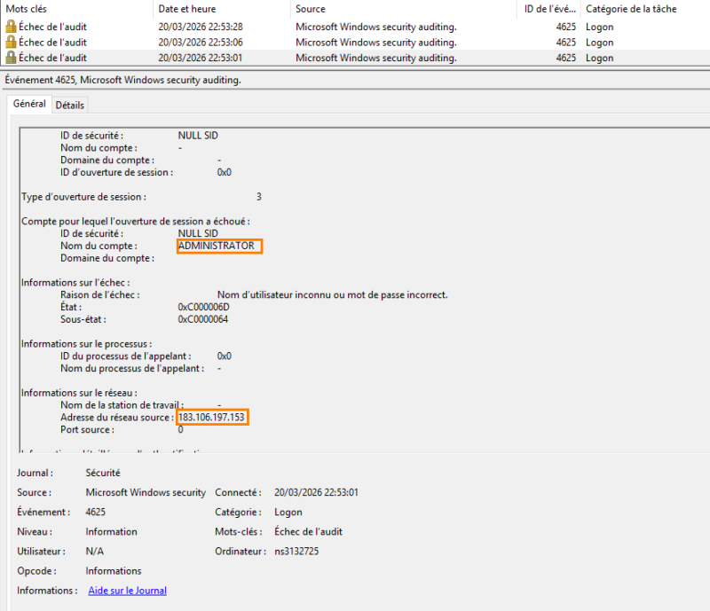 In this example, the server is clearly being targeted by a brute force attack, with a high volume of attempts. The first indicators highlight risky accounts linked to poor configuration, especially default accounts such as Guest or Administrator. These elements are taken into account in the configuration audit, which we will cover later.