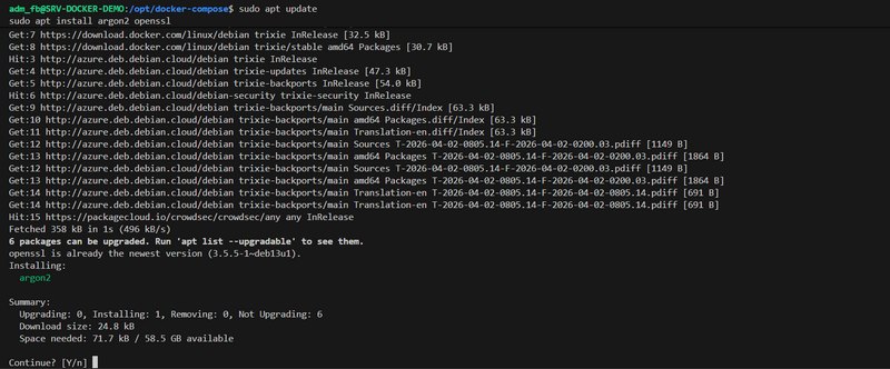 echo -n "VotreMotDePasse" | argon2 $(openssl rand -base64 32) -e -id -k 65540 -t 3 -p 4 | sed 's/\$/\$\$/g'The role of the sed command at the end is to automatically double the $ symbols in the generated string. This is required by Docker Compose syntax, which would otherwise interpret those symbols as variable references. Copy the string returned by the terminal; we will need it shortly!