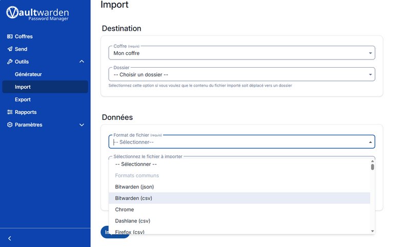But there is no need to start from scratch: if you already use another password manager, you can import your data. Vaultwarden supports different formats (KeePass, LastPass, Chrome, etc.).