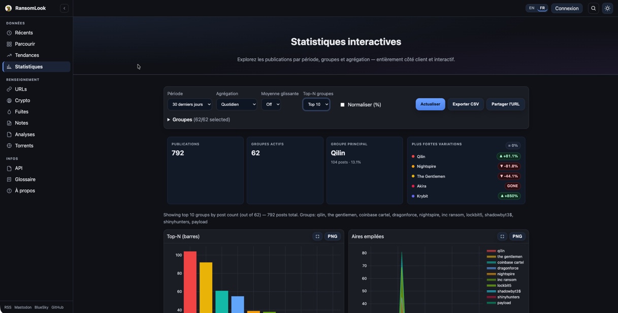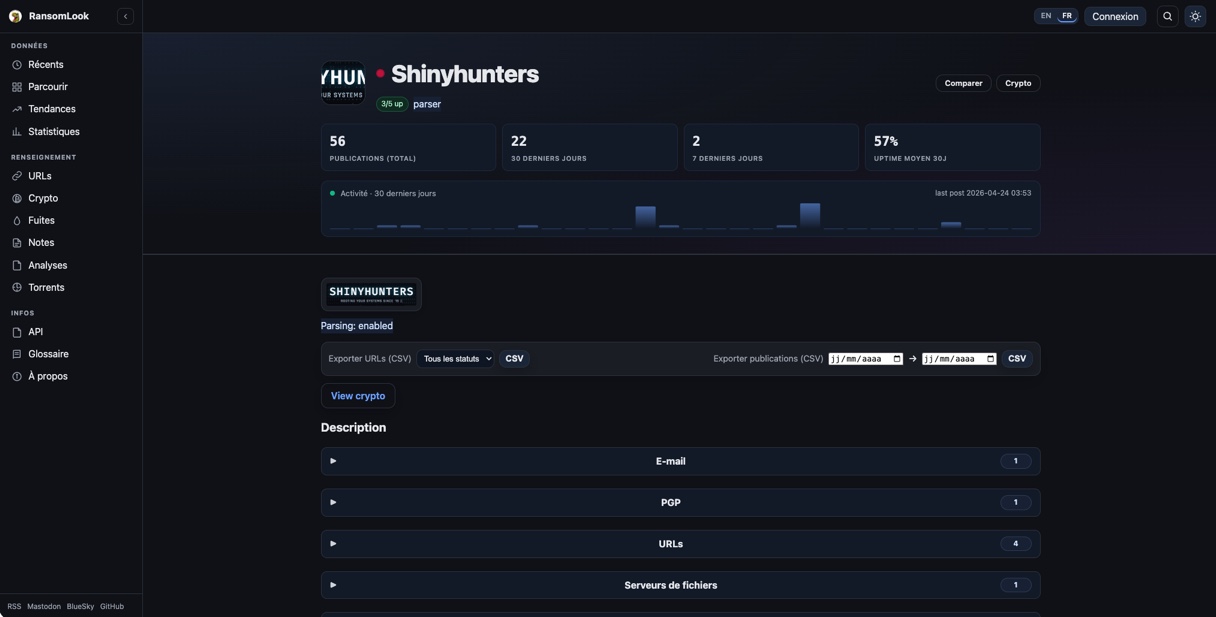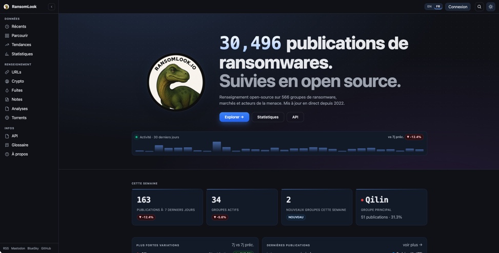 RansomLook is an open-source project that positions itself as a true platform for tracking ransomware activity. It works as an aggregator to monitor ransomware activity, including through cybercriminals' "Data Leak Sites." It is a very interesting resource for security monitoring, especially in the context of Threat Intelligence.