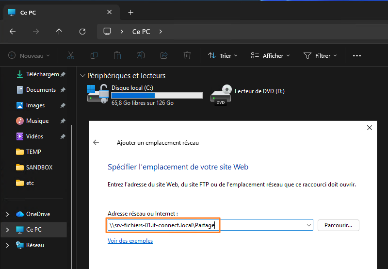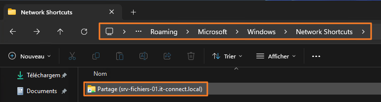 A network location is a specialized shortcut stored in the user profile. It does not consume any drive letter. It is compatible with classic UNC paths, but also with FTP addresses (ftp://serveur.domaine.local) or WebDAV URLs (which makes it possible to connect to various applications!). Just like a mapped drive, it appears in Windows Explorer, but it has no associated letter.