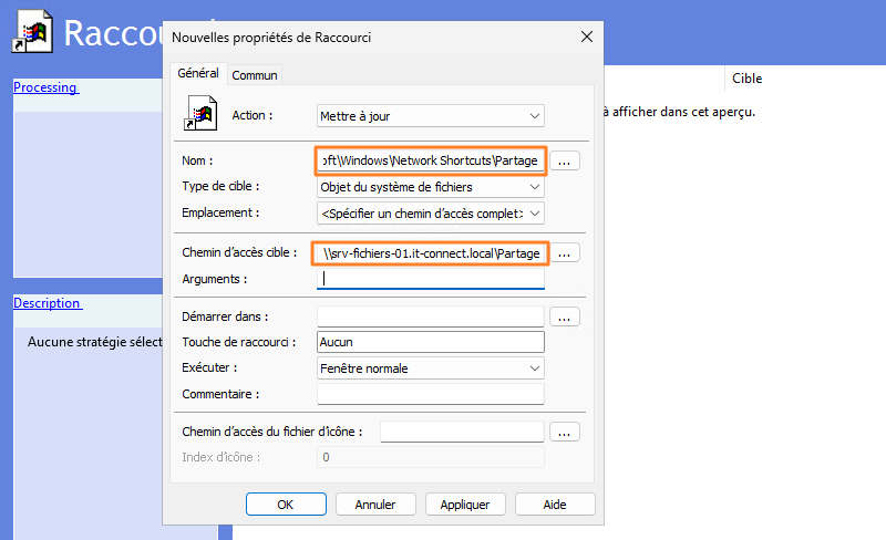 Update, so the shortcut is created if it does not already exist, and its settings are updated if it has already been deployed. - Name: the simplest approach here is to enter the full path to the folder where shortcuts are stored, while ending with the name you want to give this network location in Explorer. To name it "Partage", enter the following: