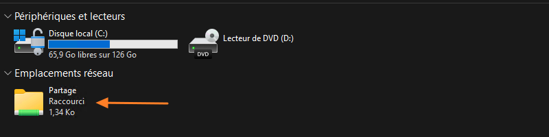 Then open File Explorer and click "This PC" in the left navigation pane. Look at the "Network locations" section: your new shortcut should be there! On my PC, it is indeed present, as shown by the appearance of the shortcut named "Partage."